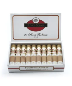 Flor De Copan Short Robusto: Cedar-wrapped handcrafted elegance with creamy wood, sweet nuttiness, and earthy coffee