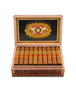 The Perdomo 30th Anniversary Connecticut Robusto Box-Pressed offers smooth, balanced flavors of cedar, cream, and Nicaraguan tobacco with a bourbon barrel-aged binder.