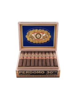 The Perdomo 30th Anniversary Maduro Box-Pressed Epicure features a 15-year-aged Cuban-seed Nicaraguan Maduro wrapper, with notes of dark cocoa, coffee, and sweet complexity.